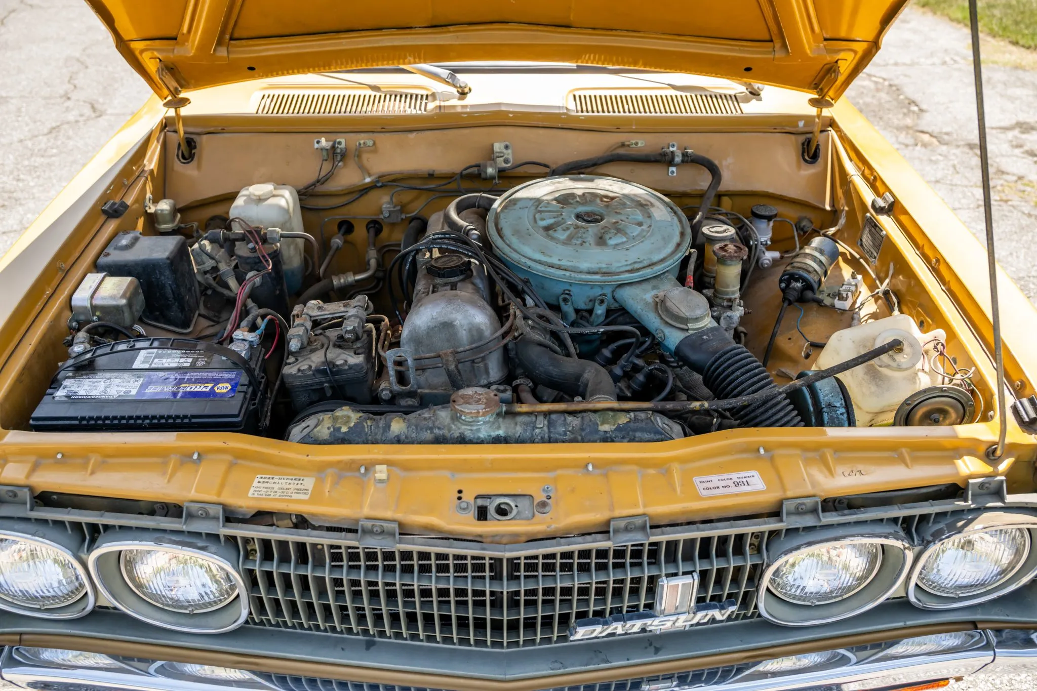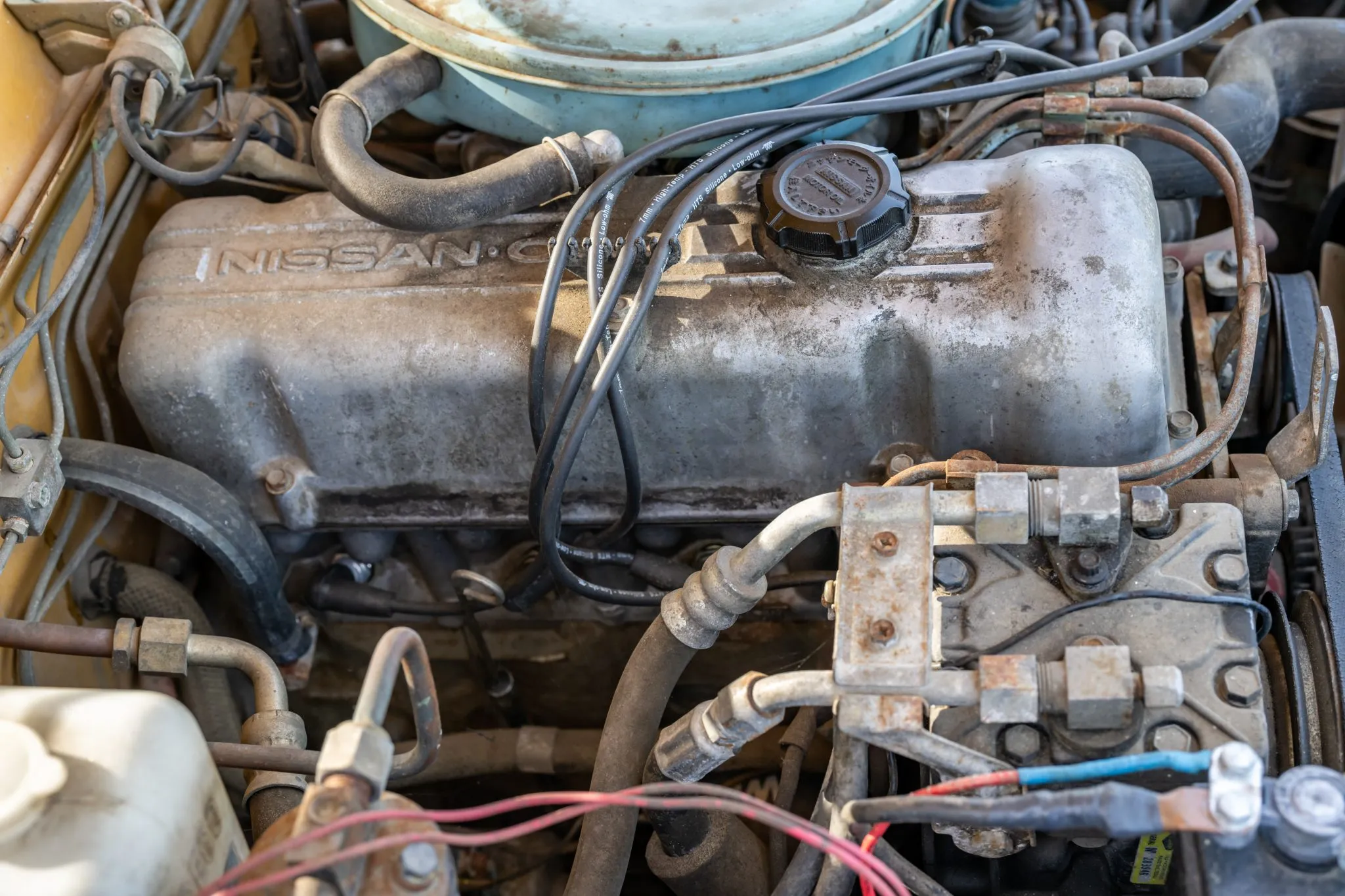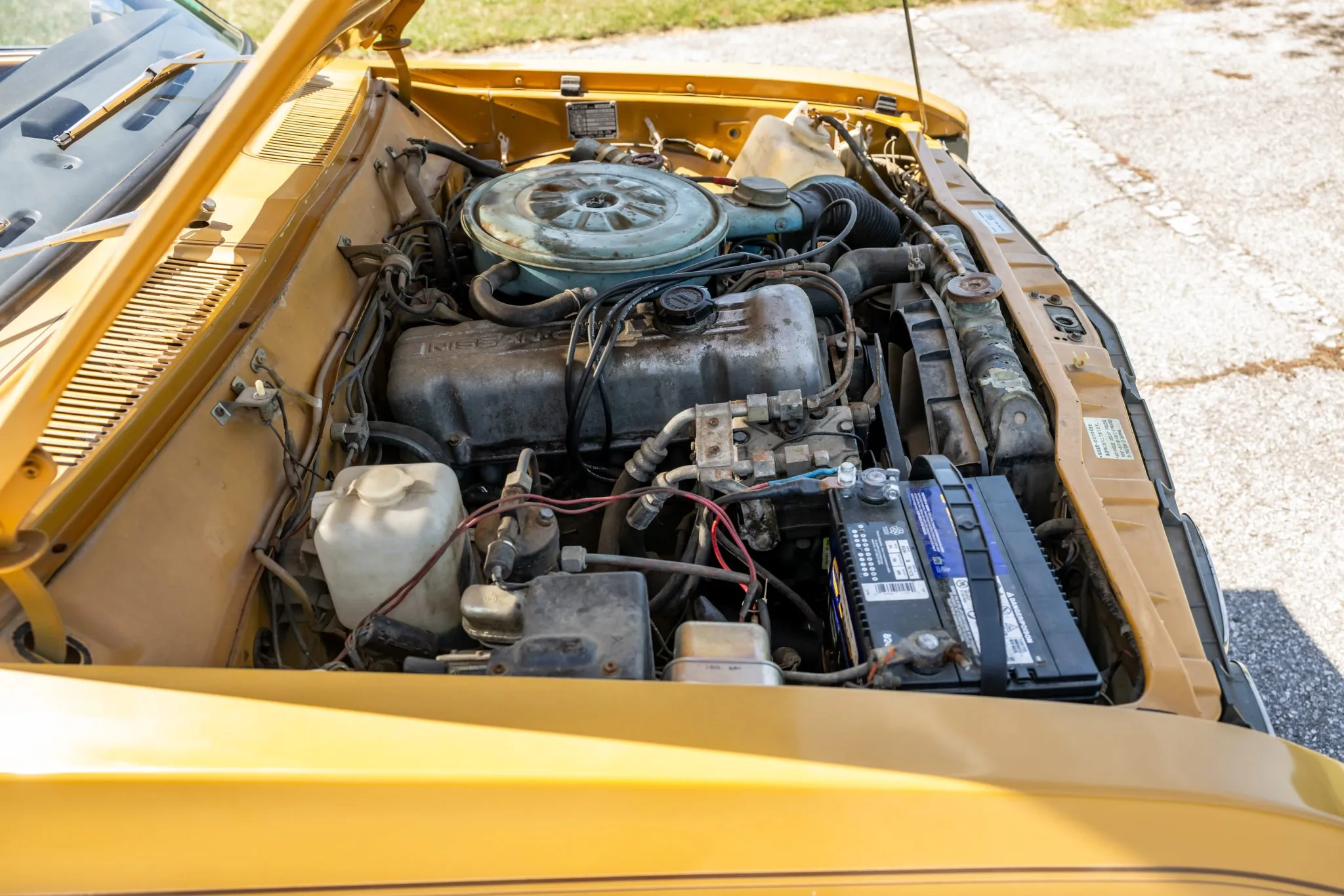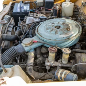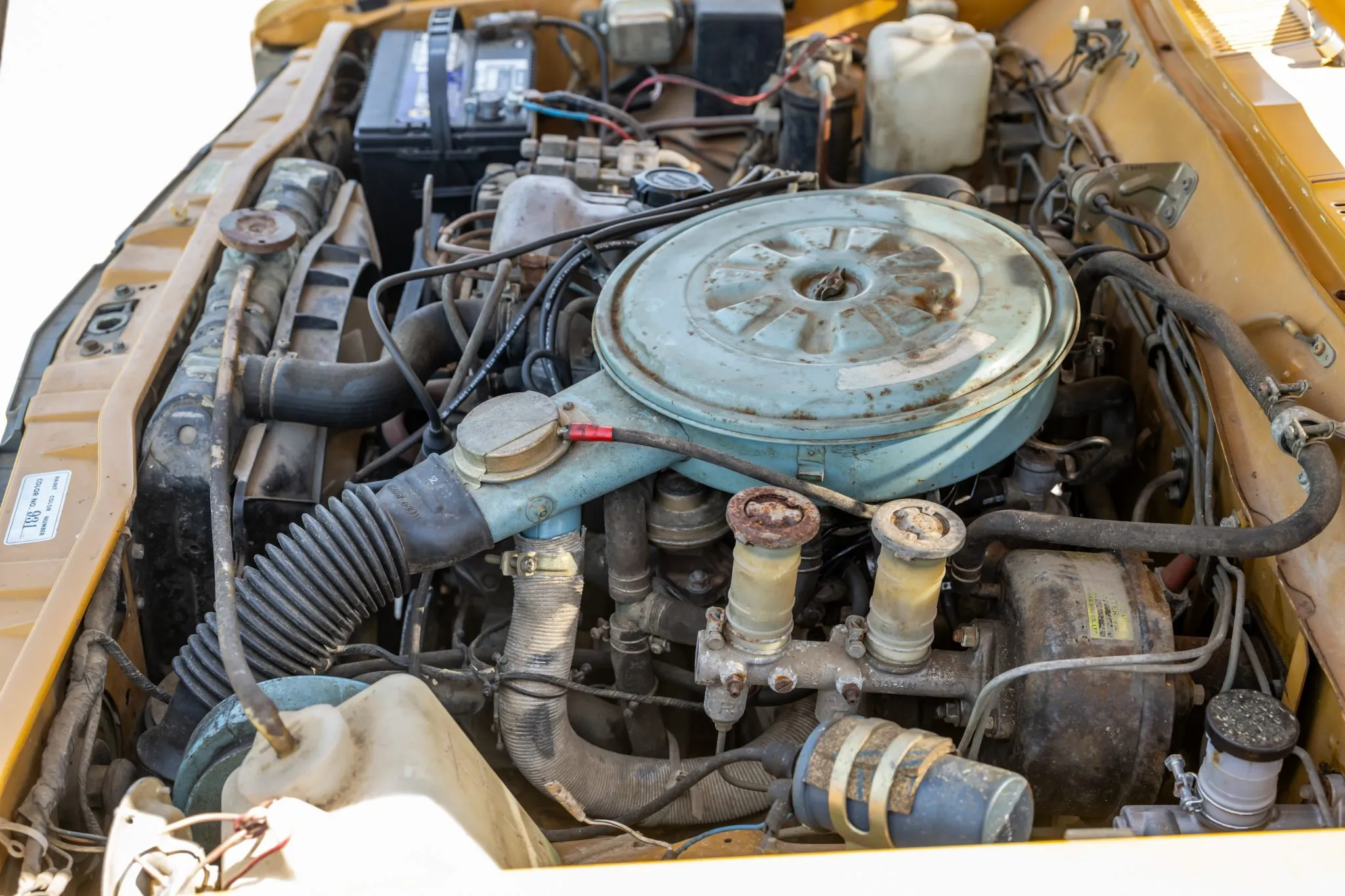 The 2.0-liter inline-four was factory equipped with a two-barrel downdraft carburetor and was rated at 112 horsepower and 108 lb-ft of torque when new. Service in February 2025 included repairing the ignition switch and replacing the voltage regulator, fuel tank, fuel pump, and fuel hoses.