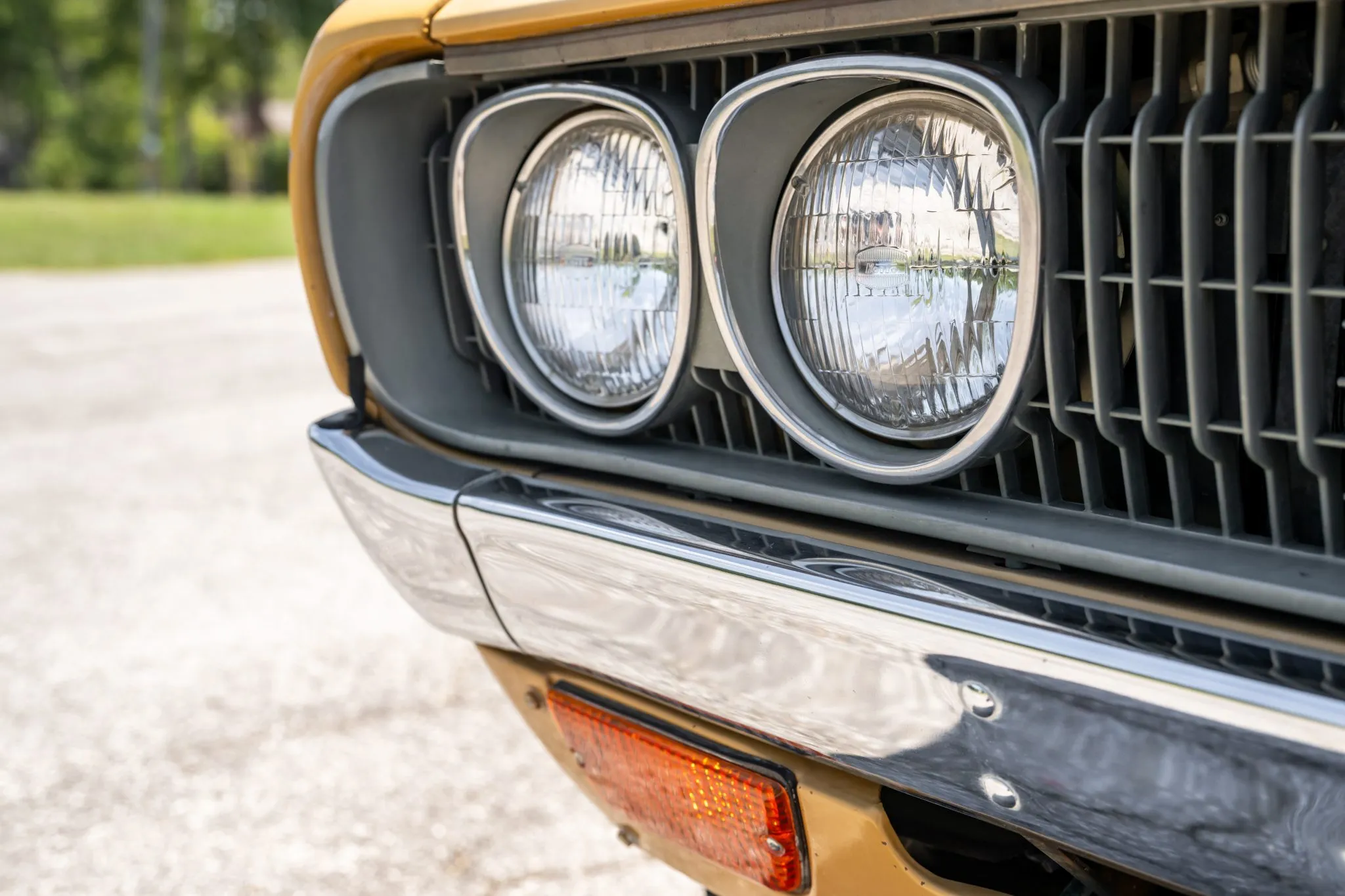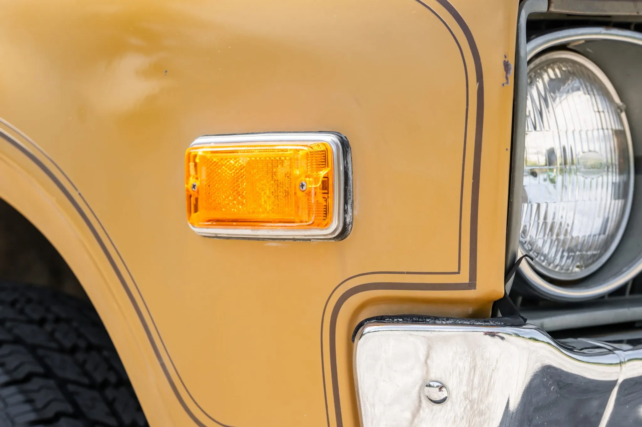 The truck is finished in Desert Gold with contrasting pinstripes and tailgate graphics, and equipment includes a stepside bed, quad headlights, and chrome bumpers.
