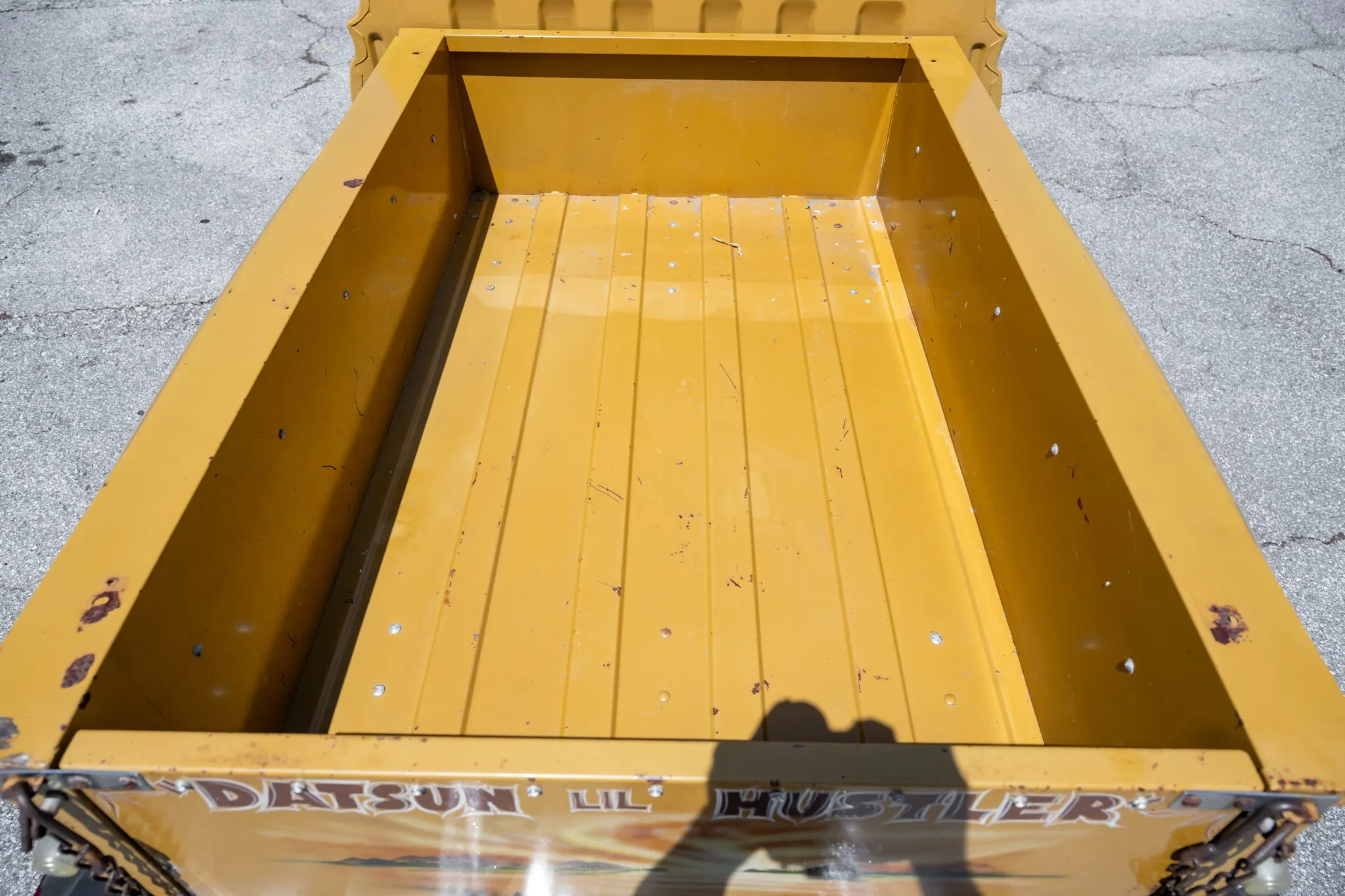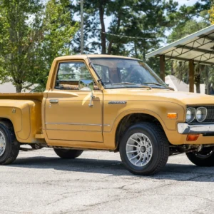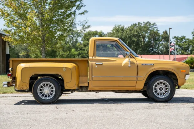 This 1977 Datsun 620 pickup is said to have been sent to California Stepside Manufacturing Co. for a stepside bed conversion prior to being sold new at McAlester Datsun in McAlester, Oklahoma. It is said to have been purchased by the seller from the mother of the original owner in 2024, and it shows 27k miles. The truck is finished in Desert Gold over tan vinyl and patterned cloth upholstery, and it is powered by a 2.0-liter inline-four linked to a four-speed manual transmission. Equipment includes 14″ turbine-style wheels, a Hitachi radio, quadruple headlights, and dual side mirrors. This 620 is offered with the owner’s manual, service records, and a clean Florida title in the seller’s name.