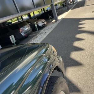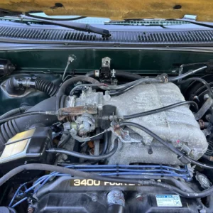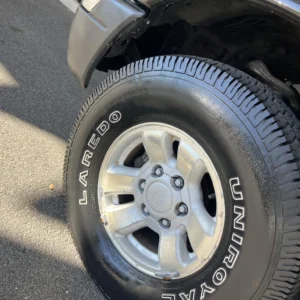 The 16″ six-spoke alloy wheels are mounted with 31×10.50″ Uniroyal Laredo tires. Braking is handled by power-assisted front discs and rear drums. The brake fluid was flushed, and the brake booster was replaced along with the front shock absorbers in March 2025. The finish on the wheels is deteriorating.