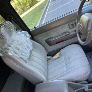 The seating surfaces are upholstered in Oak cloth, and interior amenities include air conditioning, cruise control, power windows, and a Pioneer touchscreen head unit with a backup camera and Bluetooth connectivity. The driver’s seat bottom is torn.