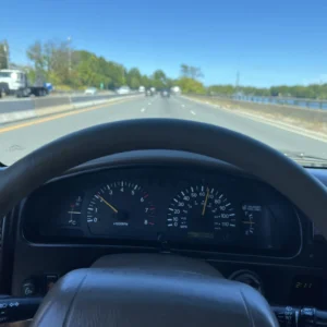 The two-spoke steering wheel frames a 110-mph speedometer and a tachometer with a 5,500-rpm redline as well as gauges for coolant temperature and fuel level. The digital odometer indicates 99k miles.