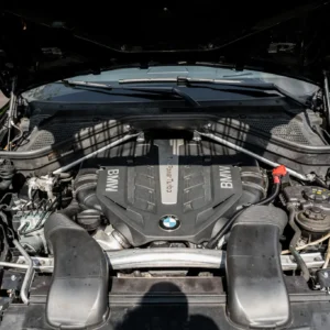 The twin-turbocharged 4.4-liter N63B4400 V8 was factory rated at 400 horsepower and 450 lb-ft of torque. The serpentine belt was replaced in September 2023, a coolant change was carried out in July 2024, and an oil change was performed in January 2025. Work performed in September 2025 consisted of replacing a turbocharger vacuum pipe and air ducts along with the crankcase ventilation lines and an engine cowl on the left side.